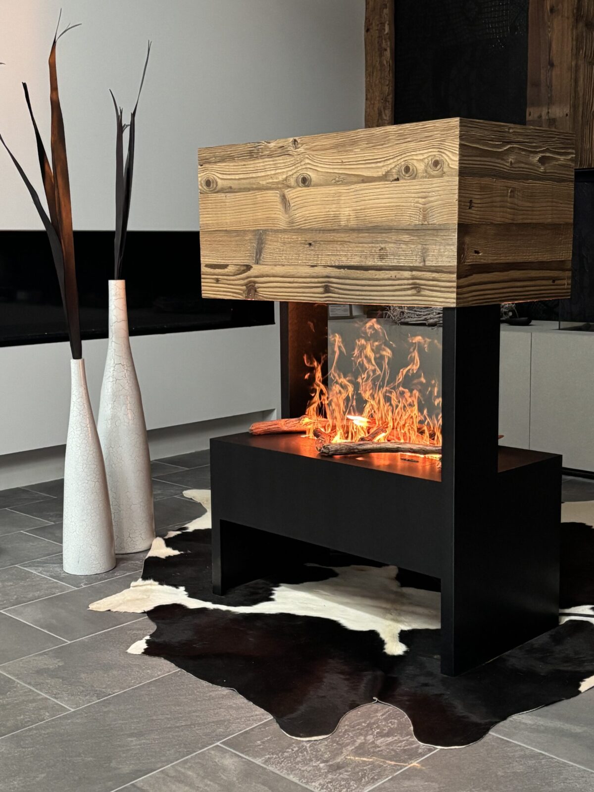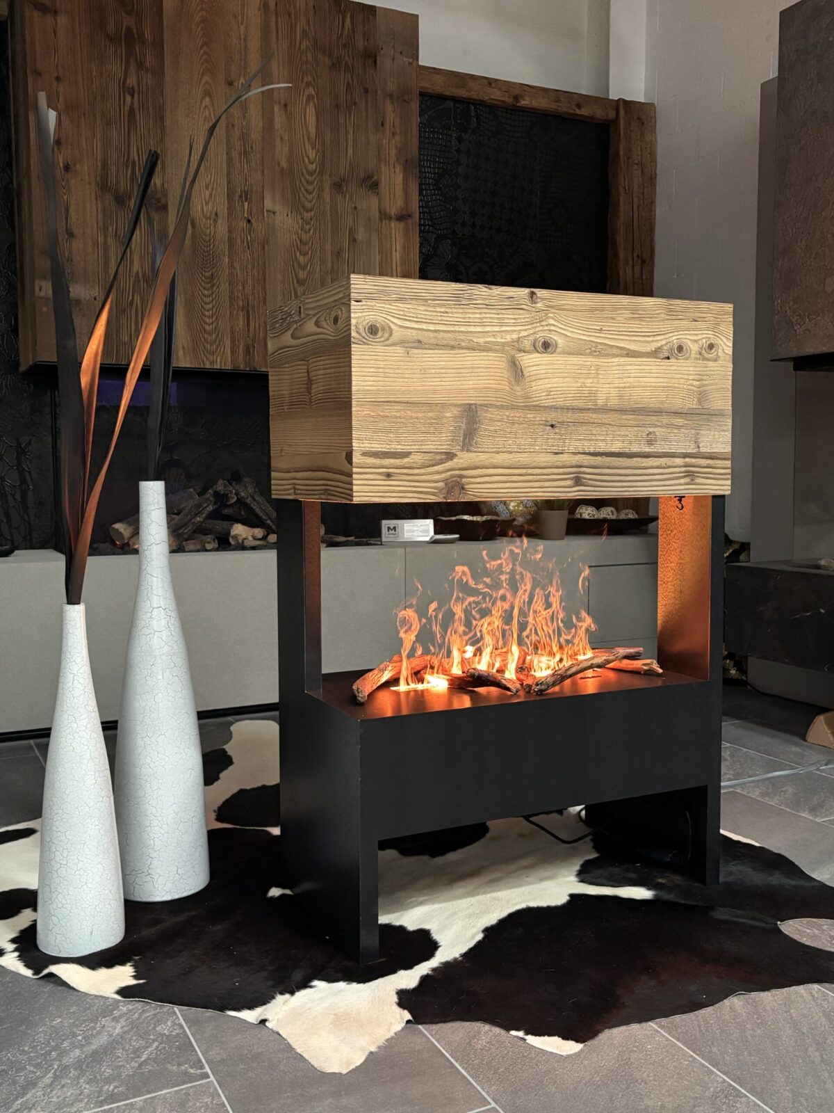 Der Kontrast aus massivem, rustikalem Holz und dem klaren, schwarzen Metallrahmen verleiht dem Objekt einen zeitlosen Charakter: ursprünglich und zugleich modern. Das Effektfeuer wird so zum atmosphärischen Blickfang, der jedem Raum eine besondere Wärme und Eleganz verleiht.