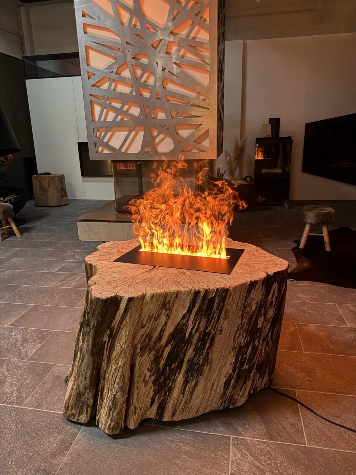 Der naturbelassene Holzstamm mit seiner markanten Maserung, Rissen und Jahresringen bildet einen spannenden Kontrast zur klaren, modernen Feuerlinie. Ob als exklusiver Blickfang im Wohnraum, in Hotels, Showrooms oder gehobener Gastronomie – dieses Effektfeuer zieht alle Blicke auf sich.