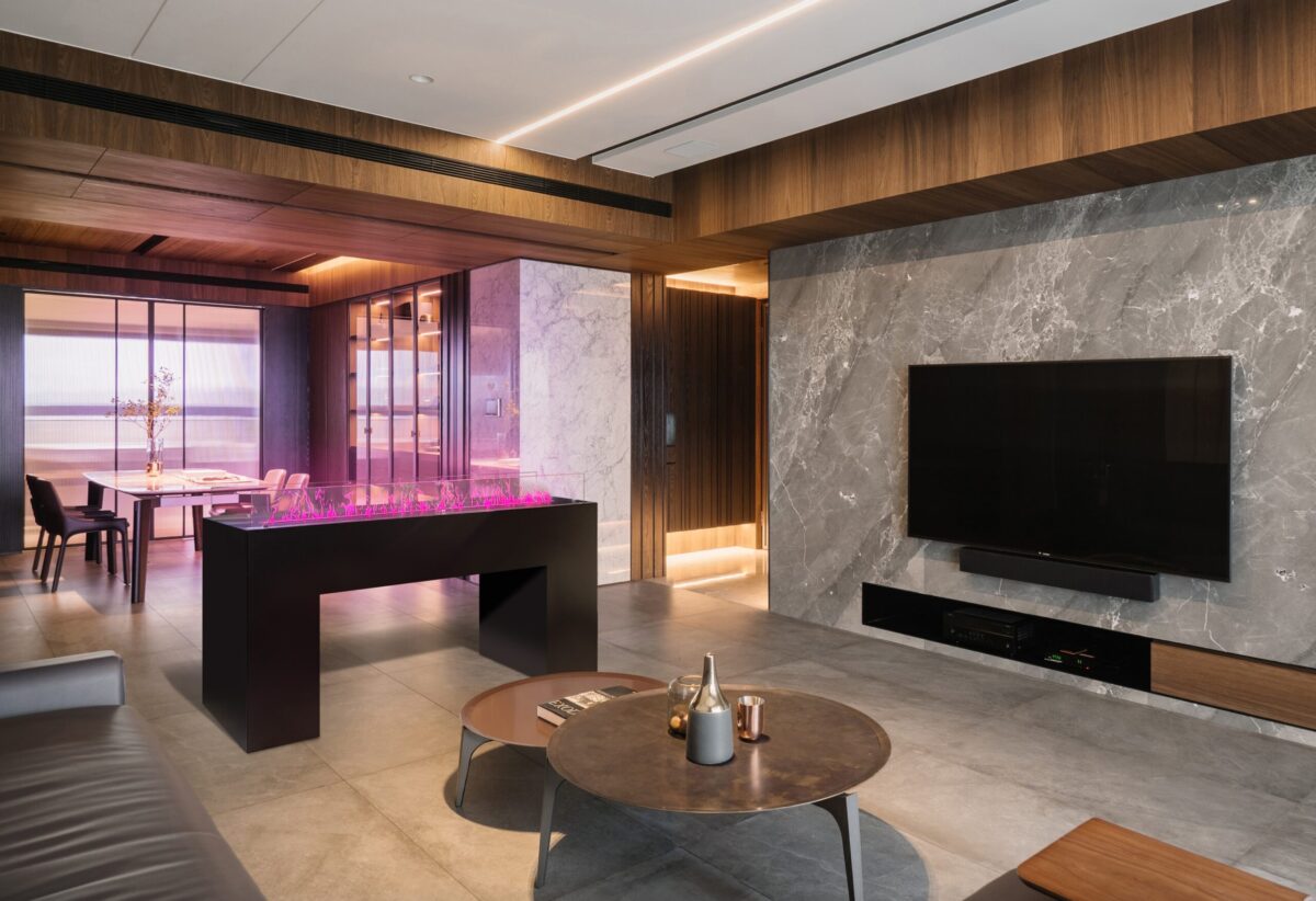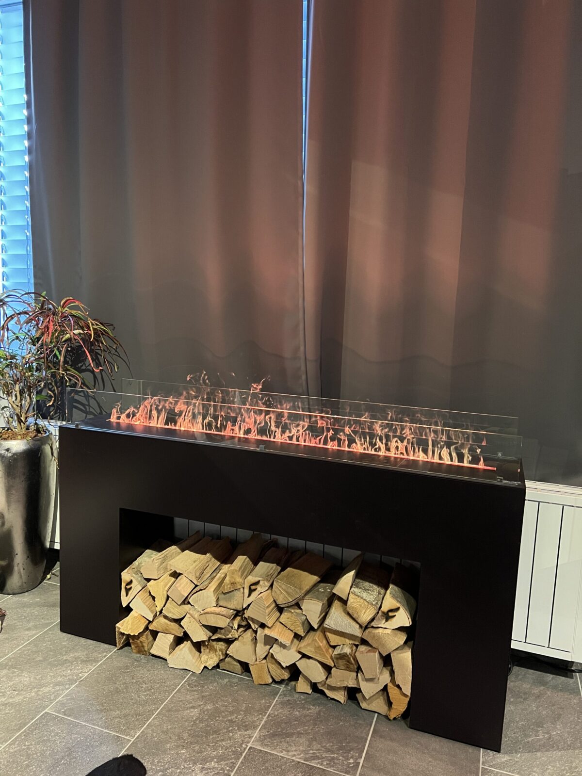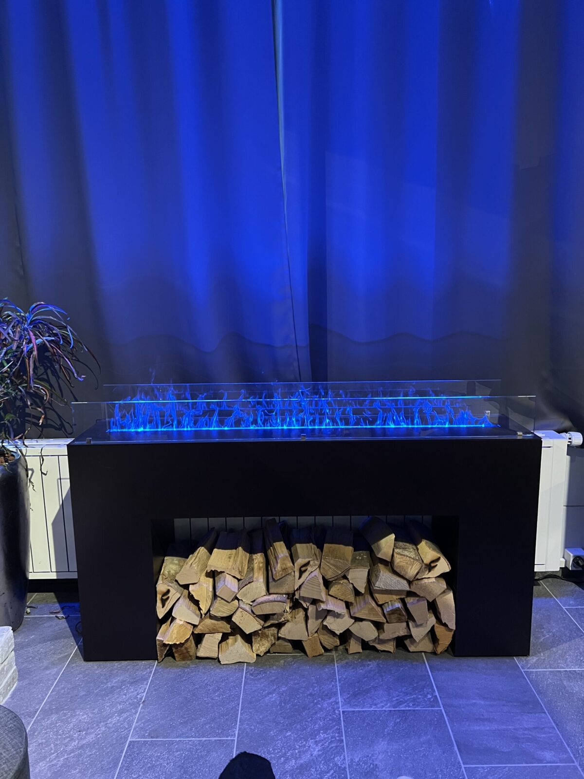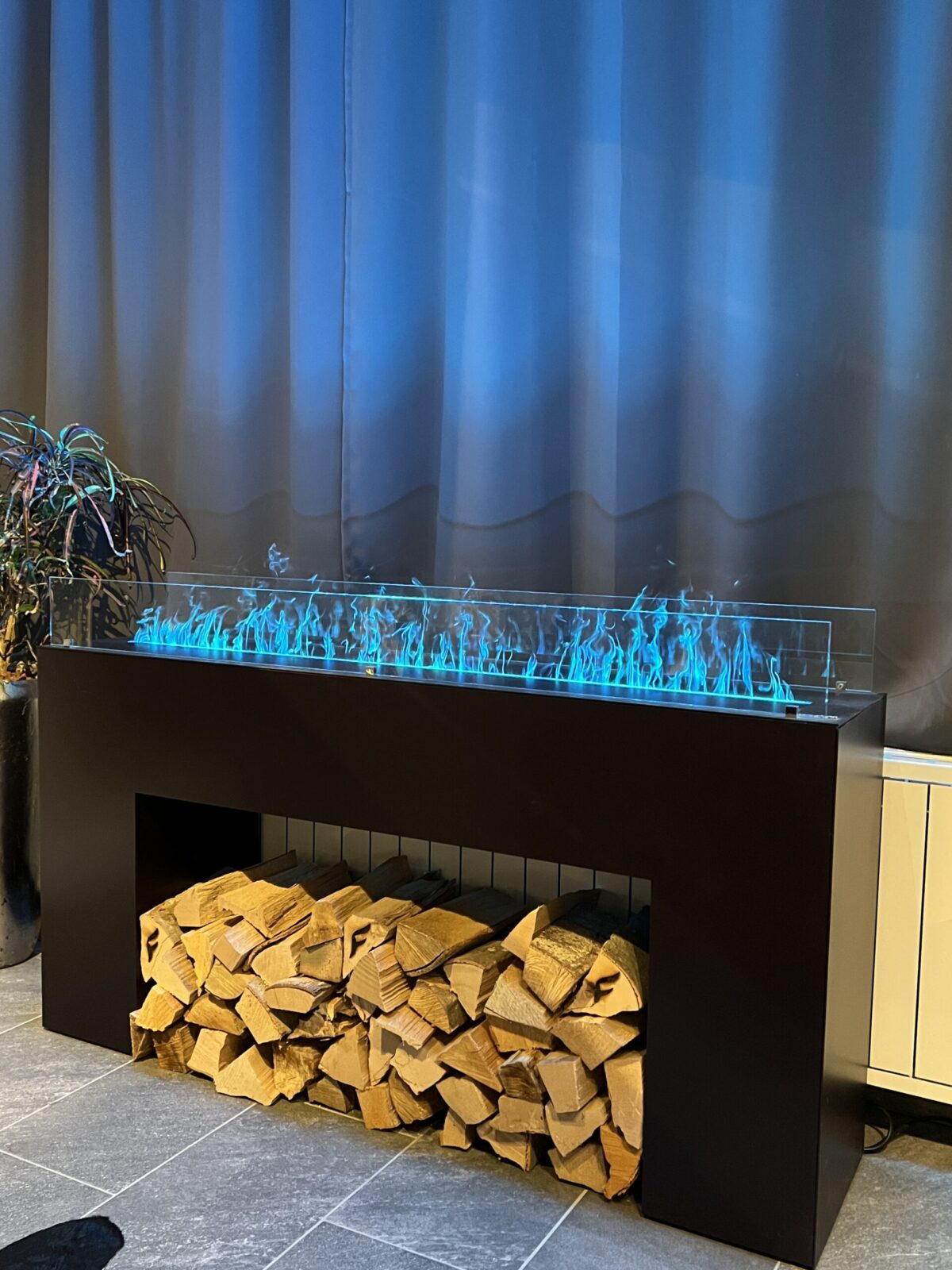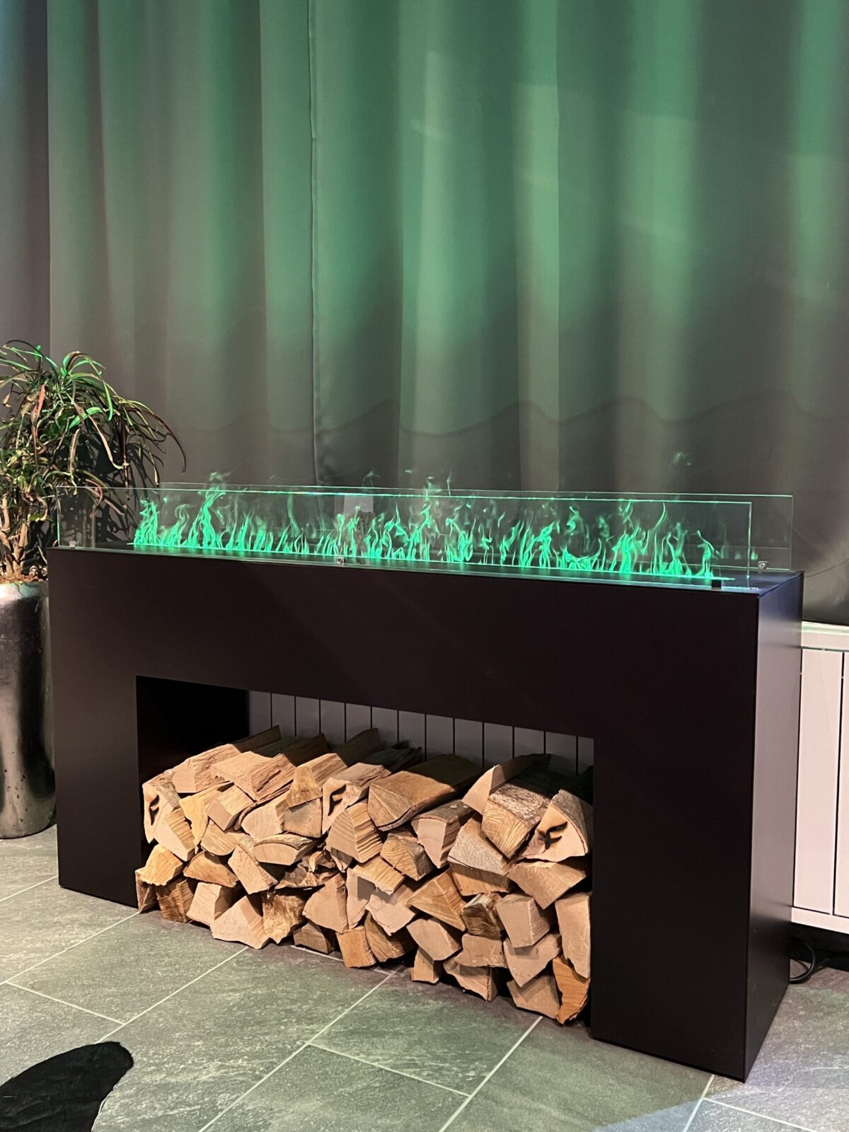 Die fein abgestimmten, intensiv leuchtenden Flammen erzeugen eine außergewöhnlich realistische Feueroptik, die hinter der Glasabdeckung scheinbar frei schwebt. Ohne Rauch, Hitze oder Geruch entsteht eine sichere, saubere Atmosphäre – ideal für Innenräume, Hotels, Lounges oder repräsentative Geschäftsräume.